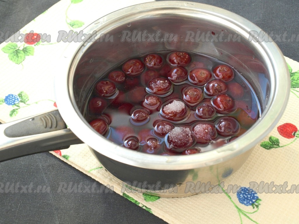 Из вишен удалить косточки, ягоды поместить в сотейник, добавить сахар и налить 300 мл воды. Поставить на огонь и довести до кипения. Параллельно в мисочку насыпать желатин и залить его 50 мл холодной воды и оставить минут на 15, чтобы желатин набух.