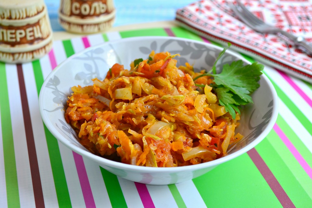 Овощи перемешать, тушить на небольшом огне, часто перемешивая, около 10 минут. В конце тушения добавить измельченную зелень петрушки и нарезанный мелко чеснок, еще раз все перемешать, прогреть пару минут и выключить газ.