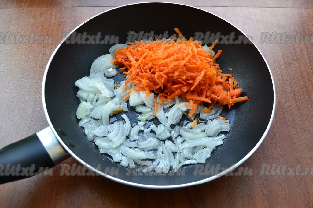 Лук и морковь очистить. Из болгарского перца удалить семена и плодоножку. Лук, нарезанный небольшими кусочками, и морковь, натертую на крупной терке, поместить на разогретую с растительным маслом сковороду.