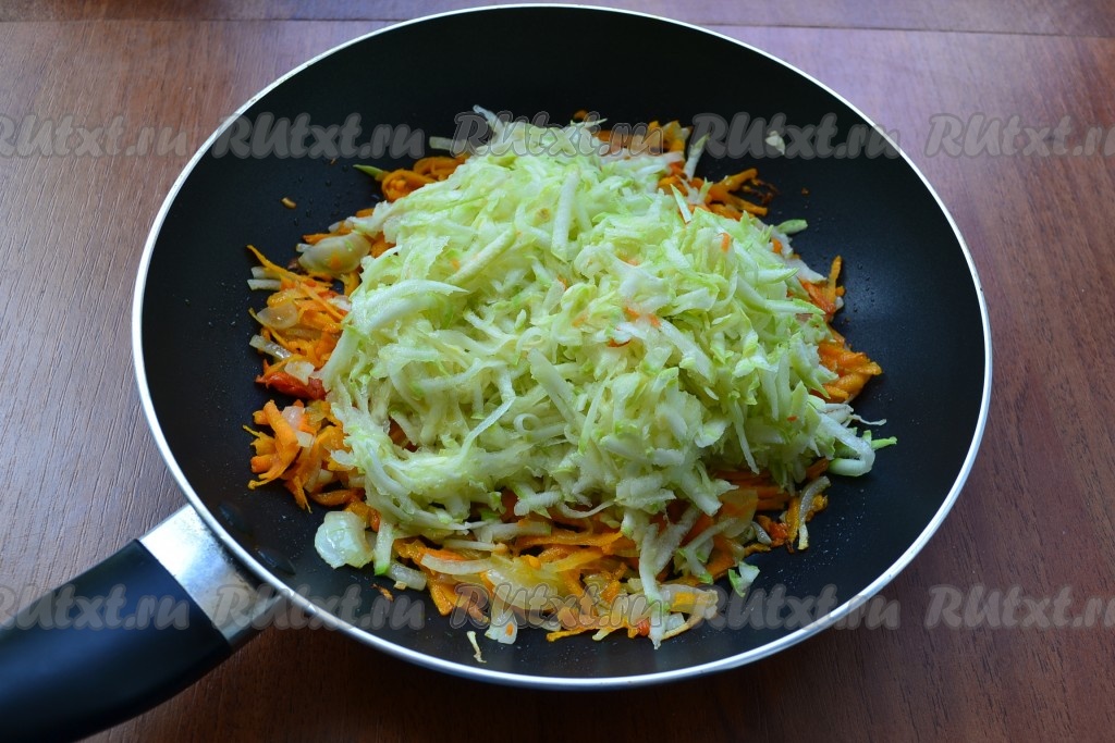 Лук с морковью обжарить на среднем огне, иногда помешивая, в течение 4-5 минут, после чего добавить натертый на крупной терке кабачок (молодой кабачок можно не очищать от кожуры).