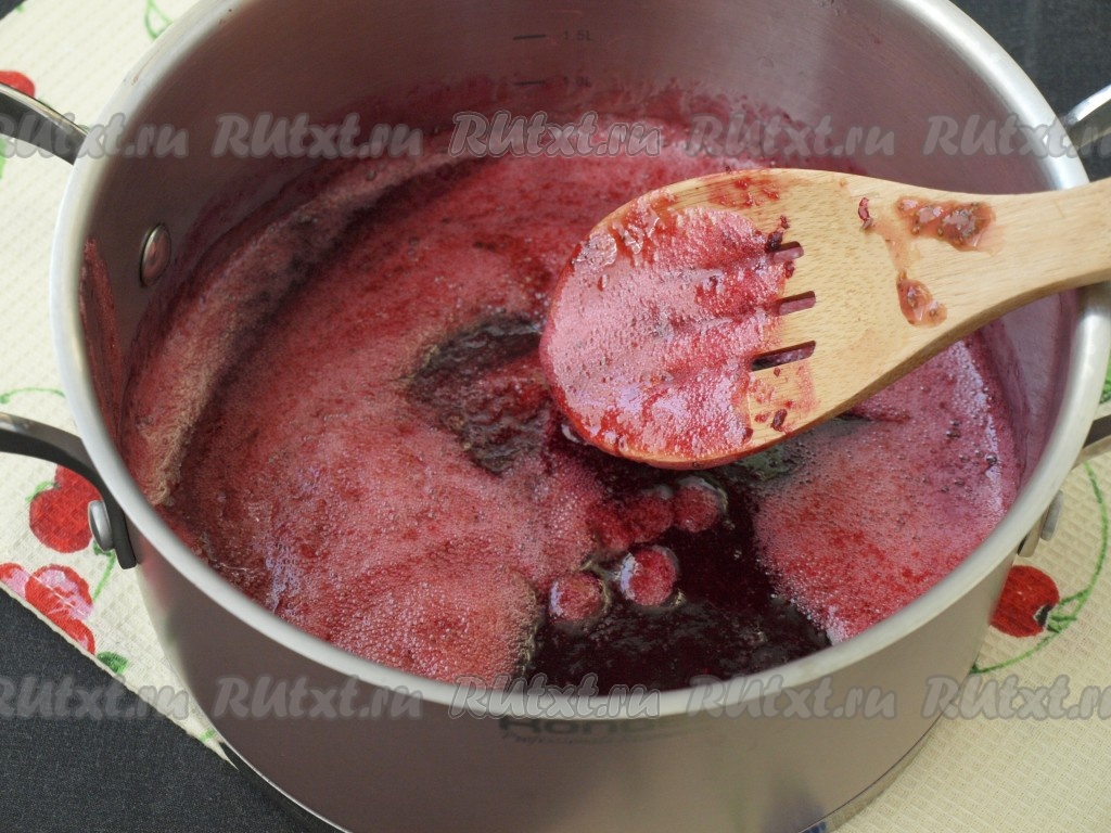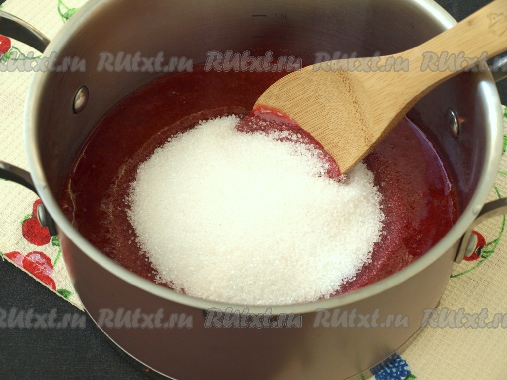 Пюре переливаем в кастрюлю с толстым дном, добавляем сахар, размешиваем и ставим на сильный огонь, прикрыв кастрюлю крышкой.