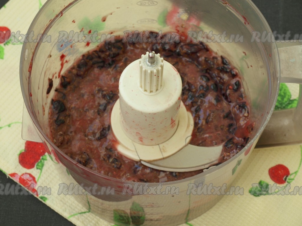 Если у вас имеется мясорубка, то чёрную смородину лучше прокрутить через неё, так как шкурка у ягод довольно плотная. У меня мясорубки нет, что собственно и останавливало меня от приготовления джема, поэтому я прокрутила ягоды в комбайне, используя насадку "металлический нож". Как видно на фото, грубые кусочки шкурки остались.