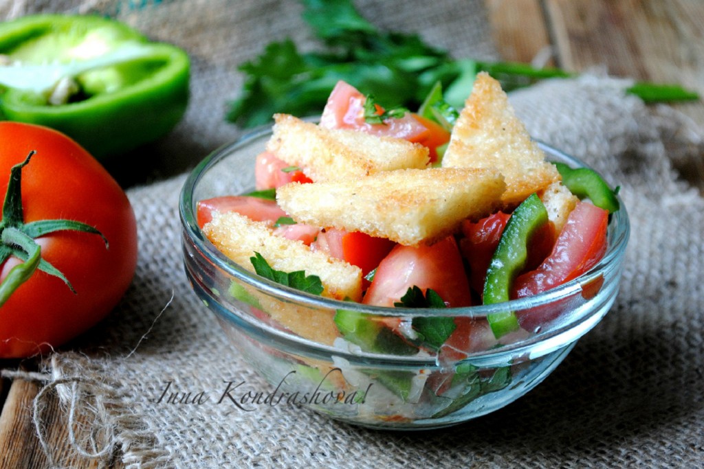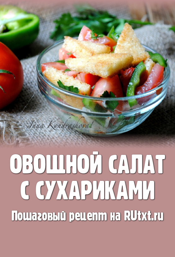 Овощной салат с сухариками готовится очень просто, а получается сочным, аппетитным и сытным. Сухарики для этого блюда можно пожарить не только из свежего, но и из вчерашнего хлеба. Этот вкусный салат нужно подавать к столу сразу после приготовления, чтобы сухарики не размякли и при подаче остались хрустящими. Отличный салатик, попробуйте!