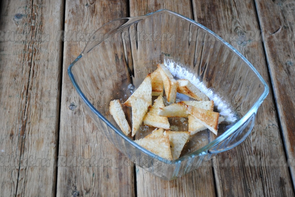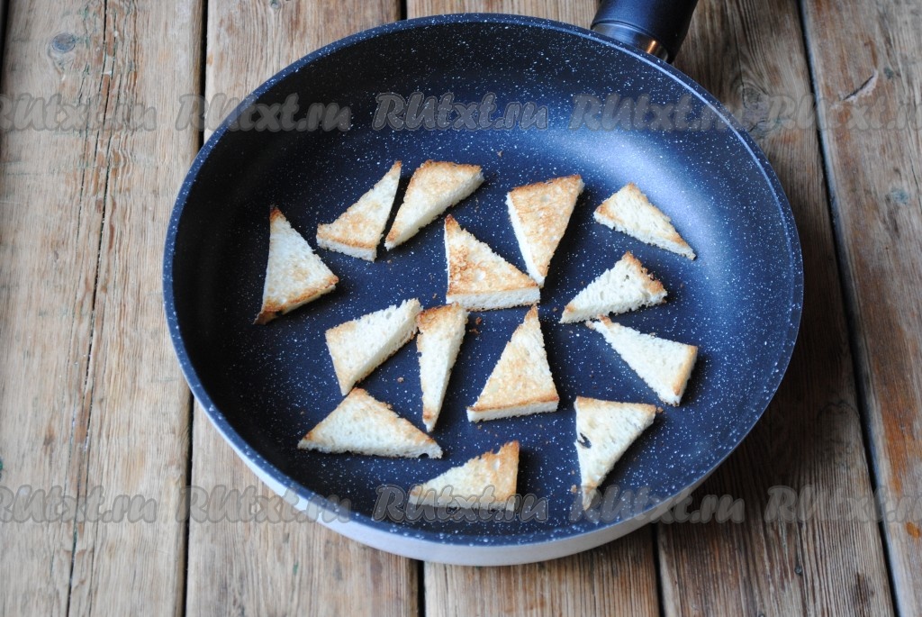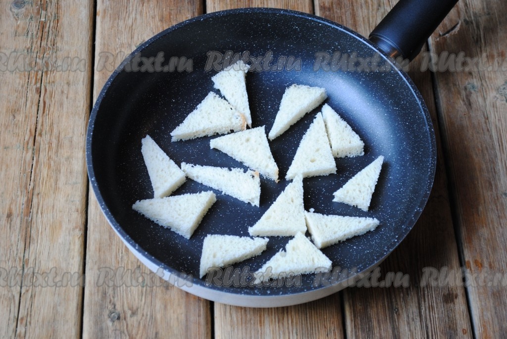 С хлеба срезать корочки так, чтобы остался только мякиш. Затем нарезать хлебную мякоть на небольшие треугольники (можно нарезать на кубики или брусочки) и выложить на разогретую сухую сковороду.