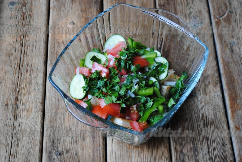 В миску с чесночными сухариками добавить помидоры, огурцы, перец и лук.