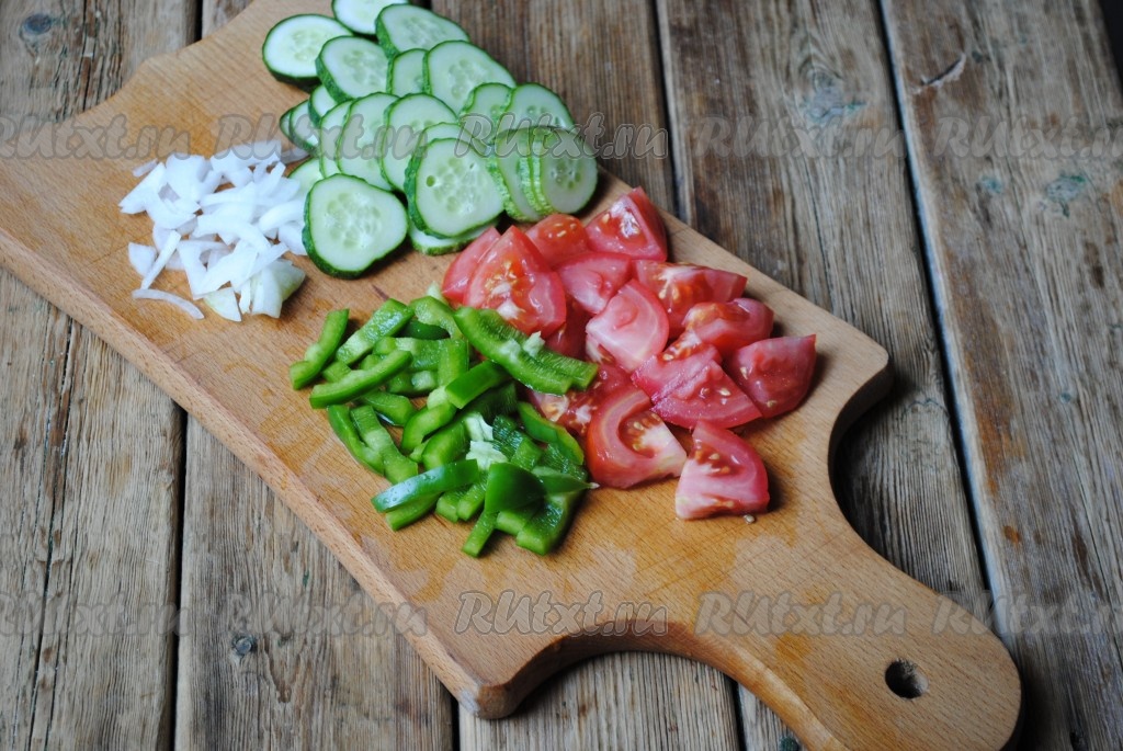 Лук очистить, из болгарского перца удалить семена. Огурцы нарезать на тонкие кружочки, лук - полукольцами (или четверть кольцами), перец - соломкой, а помидоры - на дольки.
