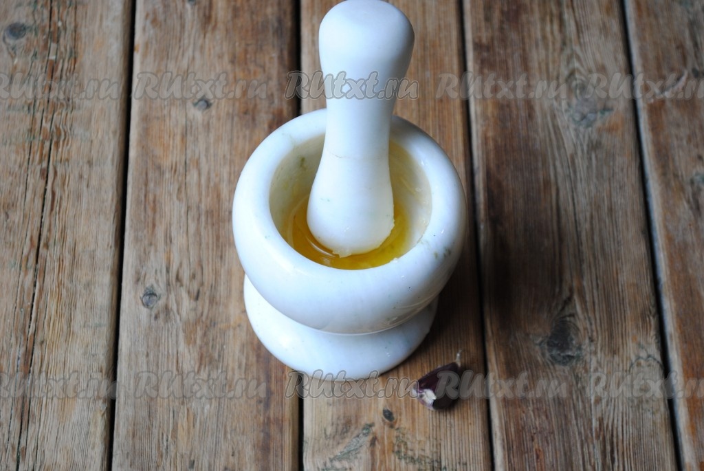 Чеснок очистить и растолочь в ступке (или пропустить через пресс). К измельчённому чесноку добавить 1 столовую ложку подсолнечного (или оливкового) масла и перемешать получившееся чесночное масло.