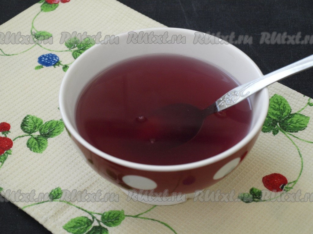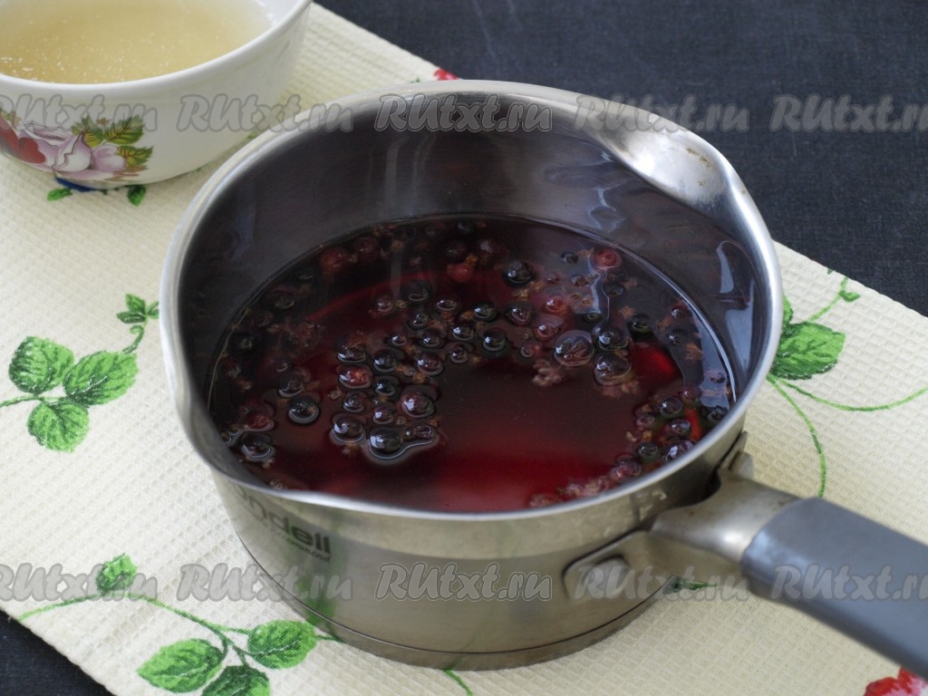Процедить горячий напиток, добавить в него набухший желатин и тщательно перемешать до растворения желатина. Ягоды, которые использовались для приготовления напитка, в желе не понадобятся.