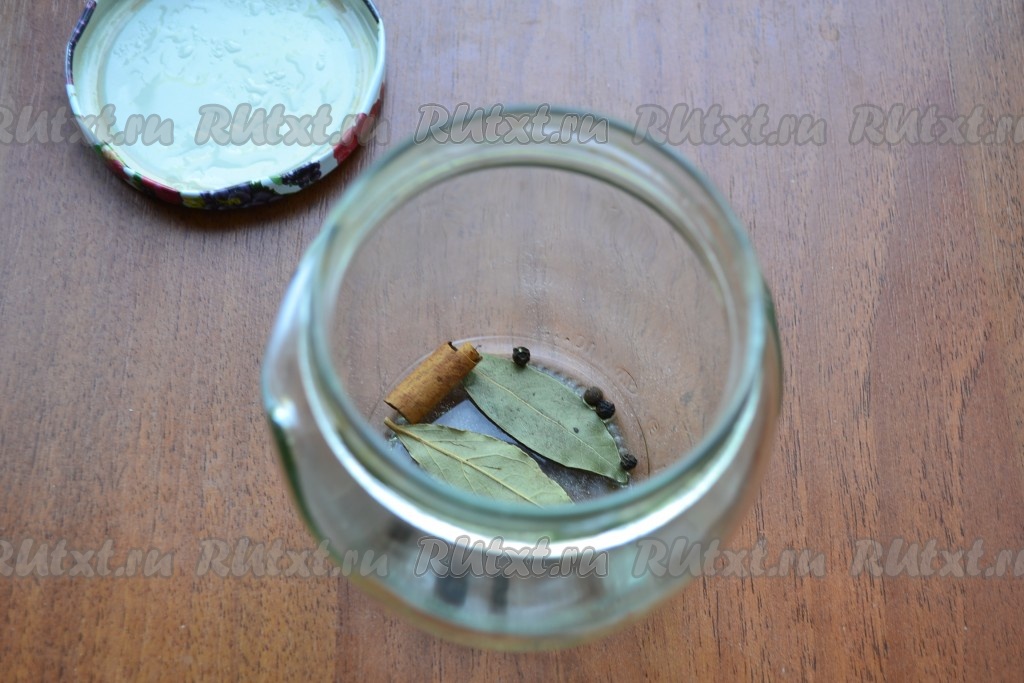 Баночку простерилизовать. На дно банки поместить лавровый лист, кусочек палочки корицы, перцы черный и душистый горошком.
