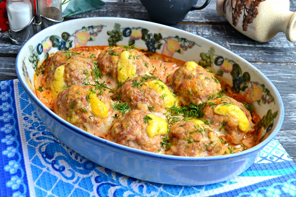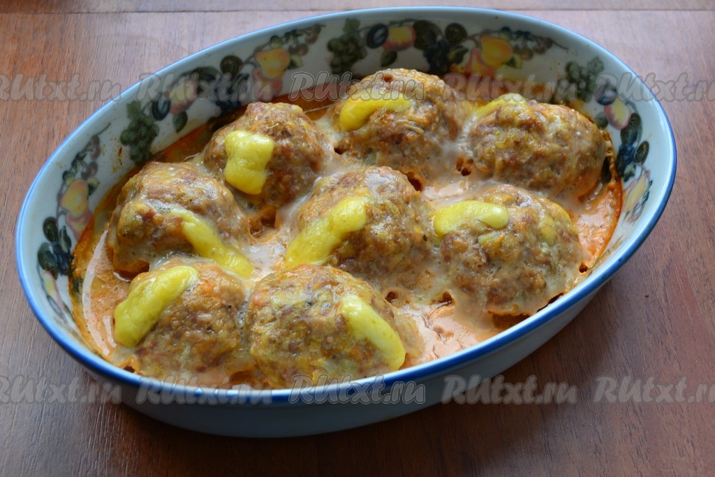 Очень нежные, сочные тефтели с сыром, приготовленные в духовке, подать горячими к столу с гарниром.