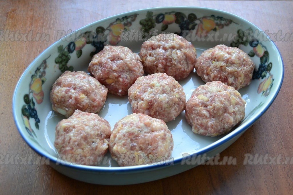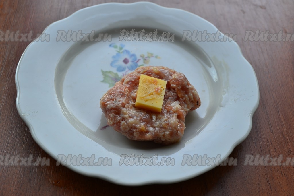 Фарш тщательно вымешать и отбить. Формировать мокрыми руками тефтели (довольно крупные), в середину каждой поместить по кубику твердого сыра.