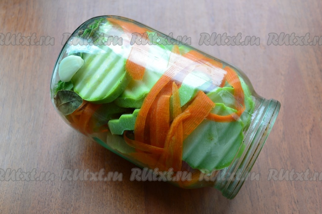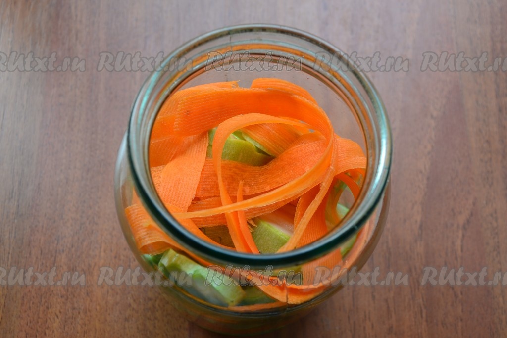 Заполнить банки кабачками, перекладывая их слайсами моркови.