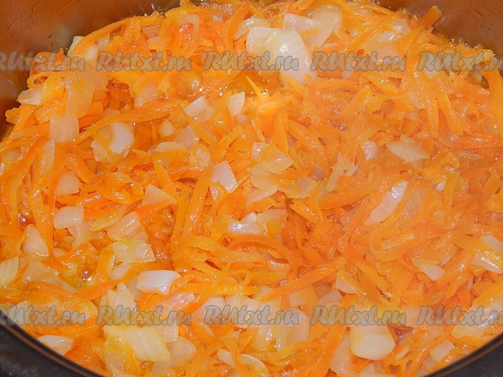 Теперь приготовим зажарку для нашей закуски. На крупной терке натираем морковь. Не очень крупно режем лук. В разогретую сковороду наливаем немного растительного масла и на слабом огне обжариваем лук, иногда помешивая, до прозрачности, затем выкладываем на сковороду морковь и обжариваем до легкого размягчения. Солим и перчим зажарку по вкусу. Сильно лук с морковкой поджаривать не нужно, они должны быть томлеными.