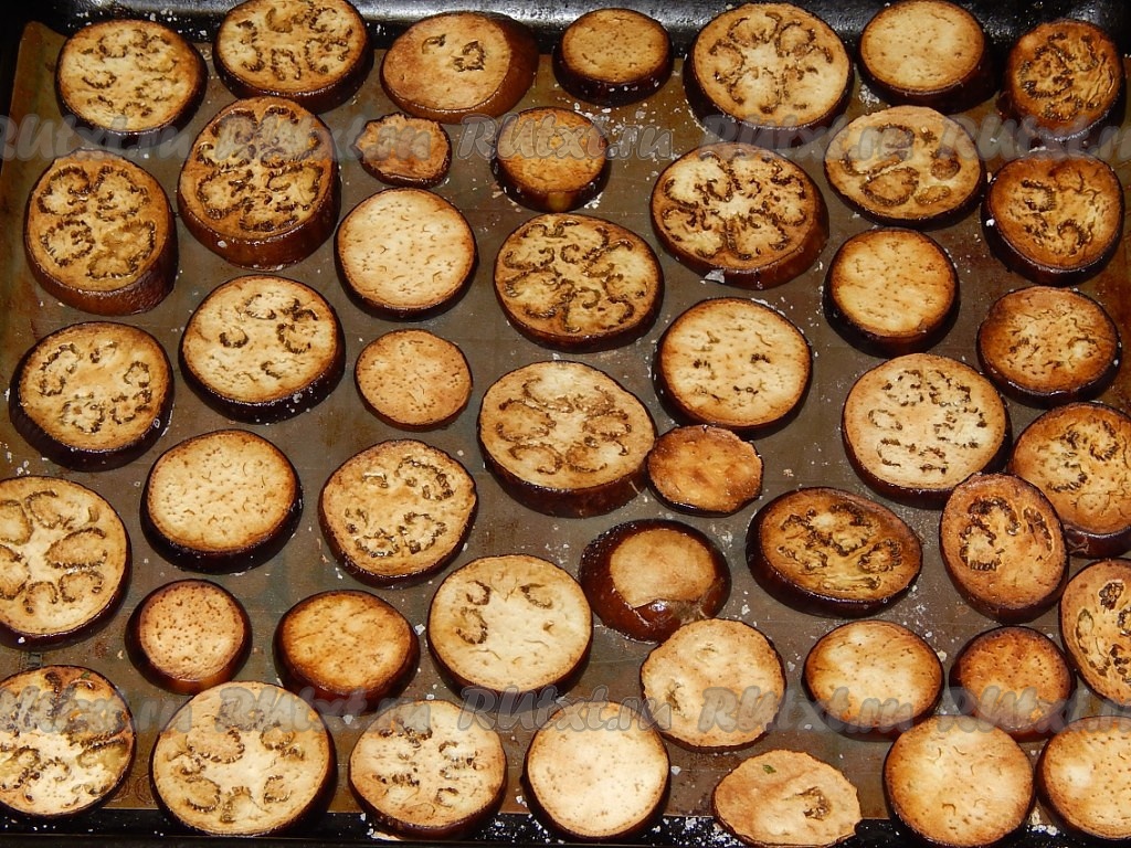 Баклажаны нарезаем кружочками толщиной 2-3 см, пересыпаем небольшим количеством крупной соли и сбрызгиваем растительным маслом. Противень застилаем силиконовым ковриком или смазываем растительным маслом. Выкладываем на противень баклажаны. Ставим в разогретую до 180 градусов духовку и запекаем 40 минут. Баклажаны не должны подрумяниться. Как только они станут мягкими – достаем. Перекладываем на тарелку и даем им остыть.