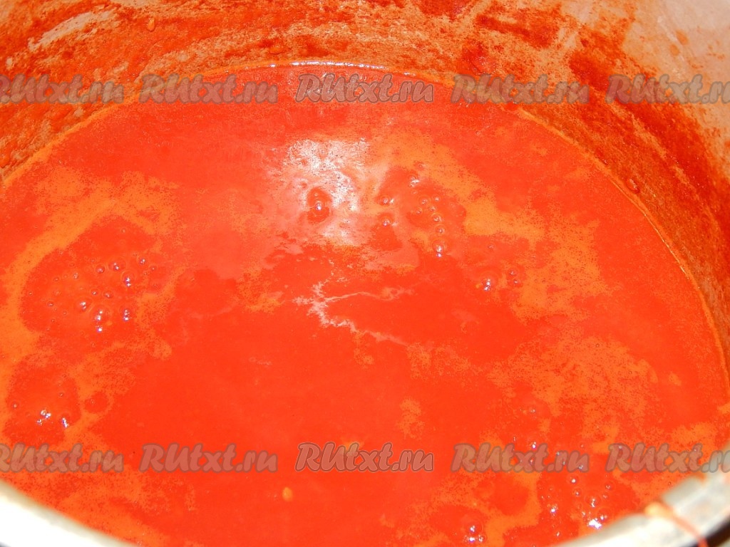 Натираем на крупной терке помидоры, выливаем натертую массу в кастрюлю, даем закипеть и выключаем огонь. Добавляем в кастрюлю к помидорам остальные ингредиенты для маринада (уксус, мед, перец, соль), перемешиваем получившийся маринад.