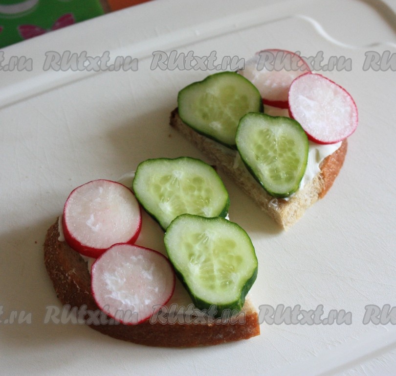 Сверху выложить нарезанные тонкими кружочками свежий огурец и редис.