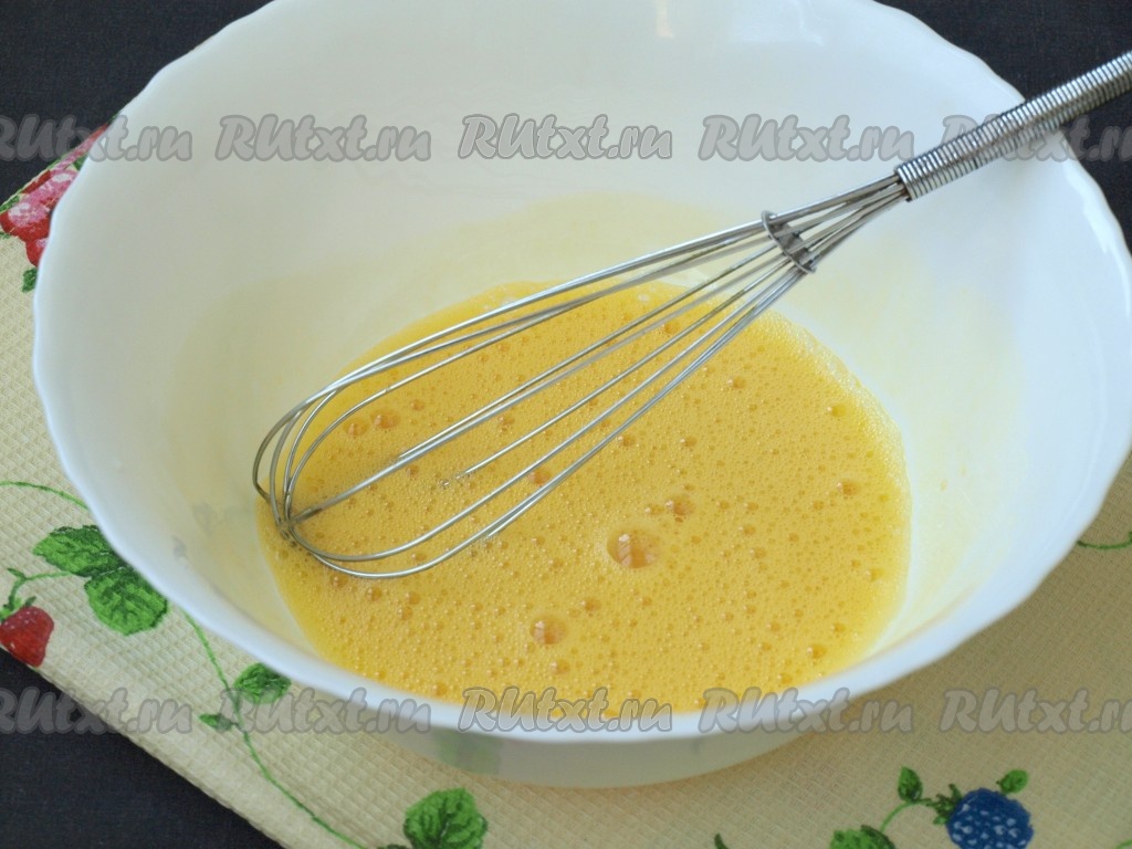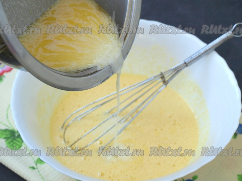 Растопить сливочное масло, слегка остудить, затем смешать его с кефиром и добавить к взбитым яйцам, перемешать.