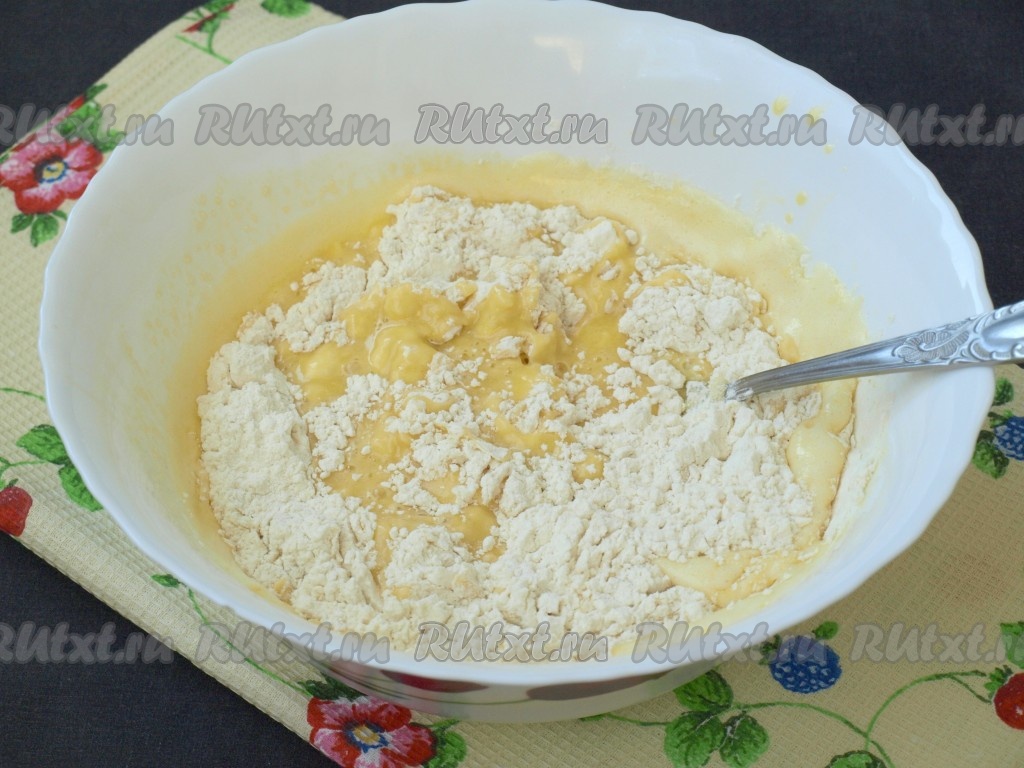 Добавить в тесто просеянную муку с содой и перемешать. Тесто будет, как густая сметана.