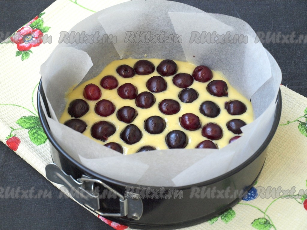 Из черешни удалить косточки. Если ягоды крупные, то можно разрезать пополам. Форму (у меня форма диаметром 22 см) застелить пергаментом, налить на дно немного теста. Поверх теста разложить черешню.