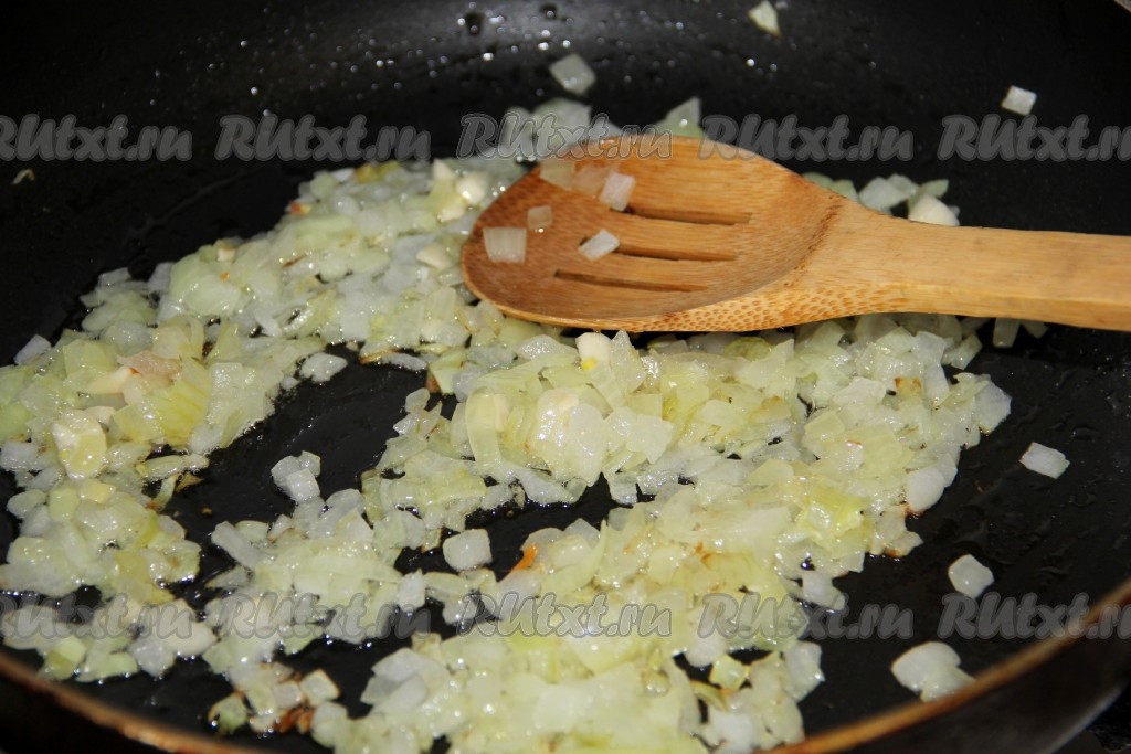 Вначале приготовим начинку для лазаньи. Обжариваем мелко нарезанный лук на сковороде.