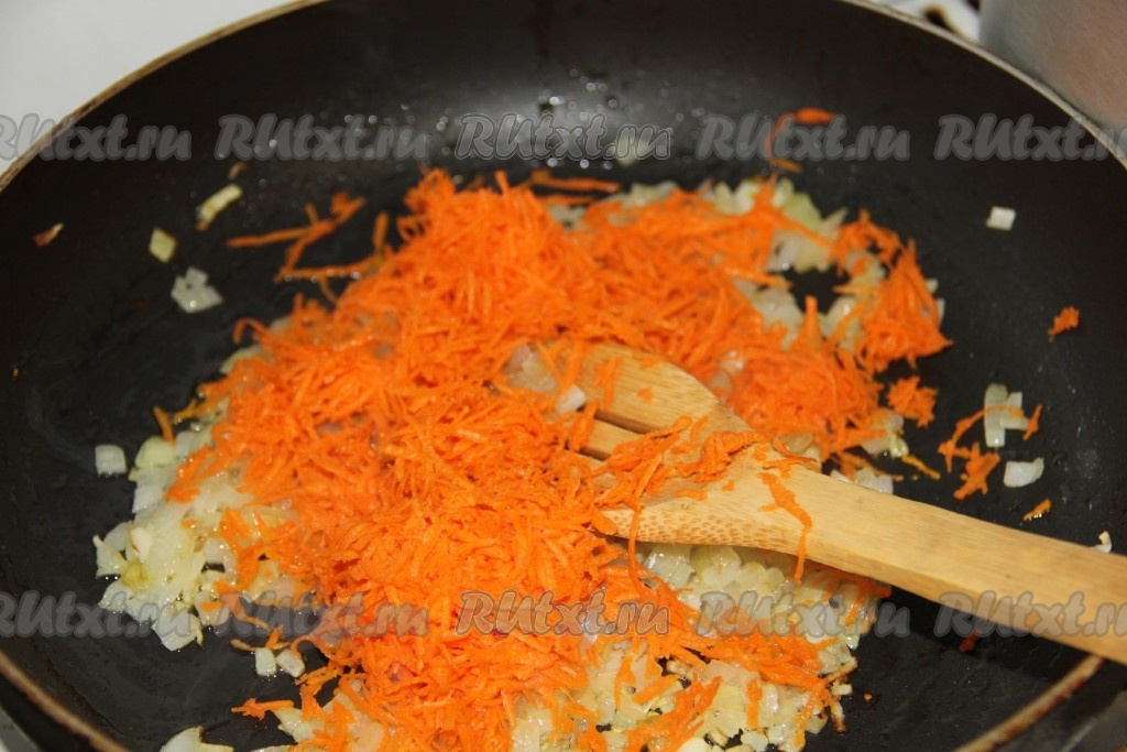 Когда лук приобретет золотистый цвет, добавляем натертую на мелкой терке морковь.