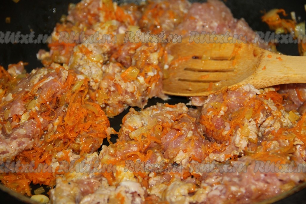 Немного потушив овощи, добавляем к ним фарш.