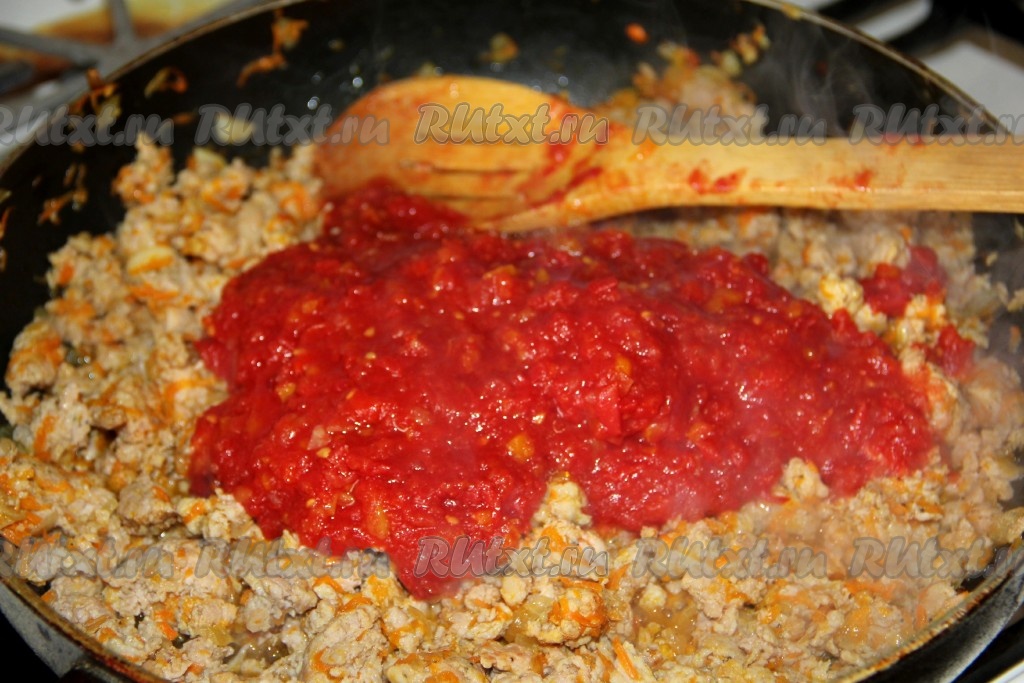 Затем добавляем натертые на терке помидоры, солим, перчим и тушим минут 5-10 под крышкой. Начинка для лазаньи готова.