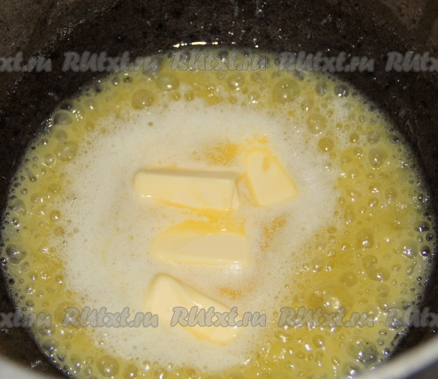 Приступаем к приготовлению соуса Бешамель. В казанке разогреваем сливочное масло.