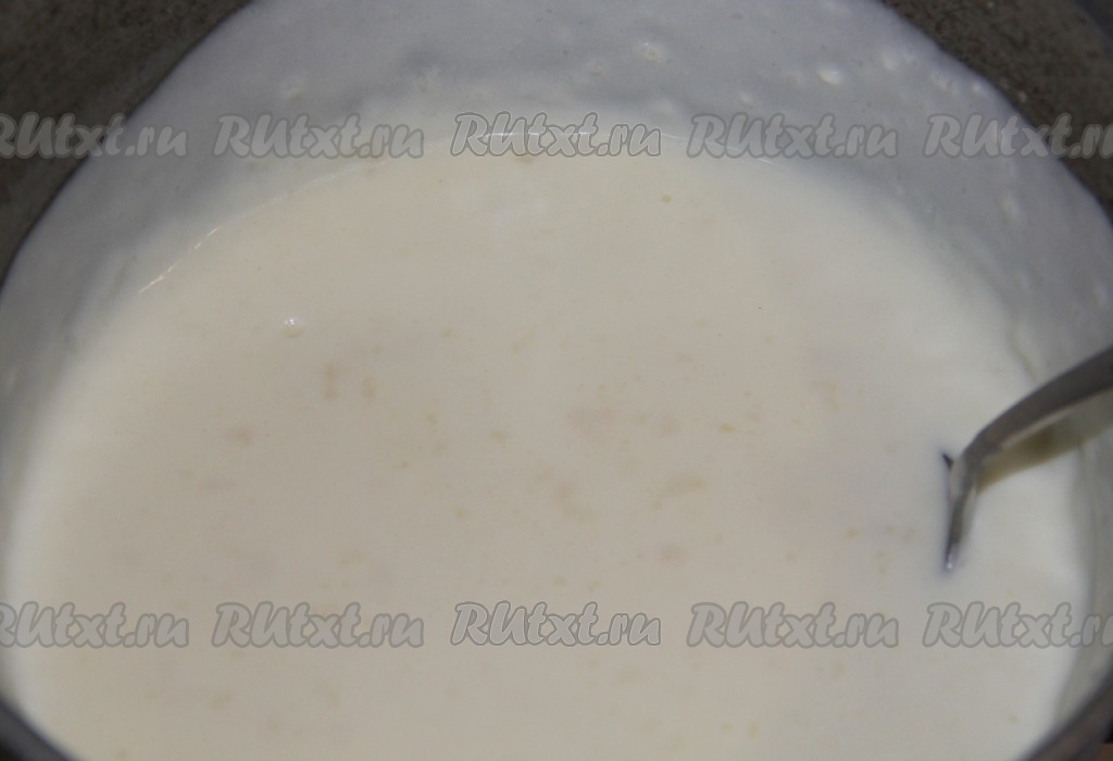 Тонкой струйкой добавляем молоко, не забывая интенсивно помешивать, солим. Когда соус загустеет до консистенции сметаны, выключаем газ и даем соусу остыть.