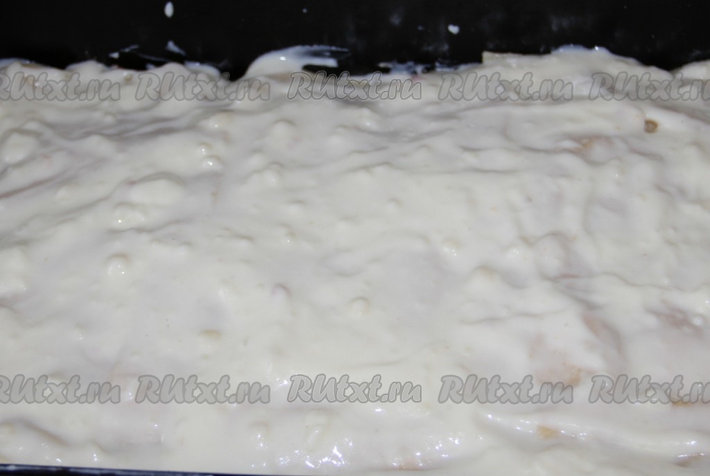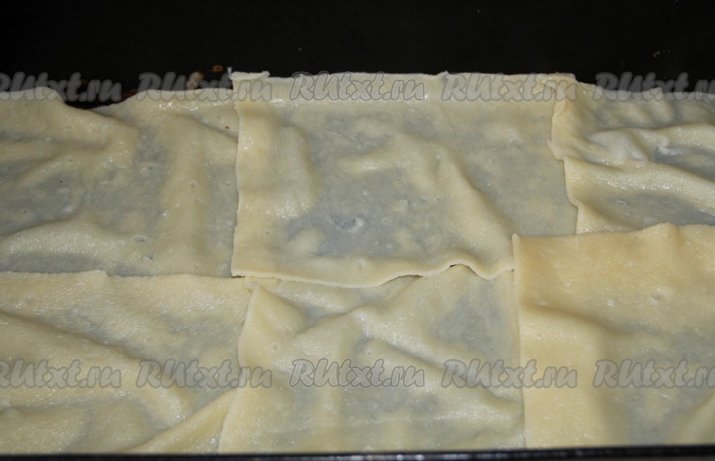 На дно формы выкладываем листы лазаньи. У меня листы лазаньи самодельные, поэтому отваренные. Если листы покупаете в магазине, то инструкцию по их применению (отваривать или нет) читайте на упаковке.