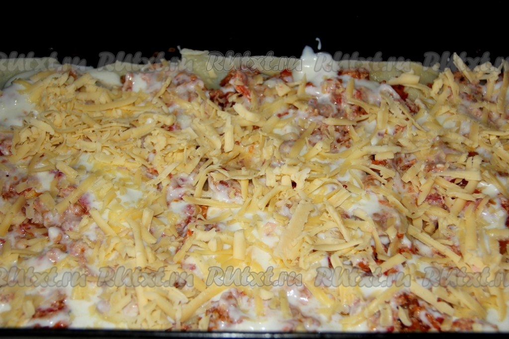 Опять кладём листы лазаньи, оставшийся фарш, 1/3 соуса Бешамель, половину порции натёртого сыра. Накрываем все листами лазаньи и заливаем оставшимся соусом.