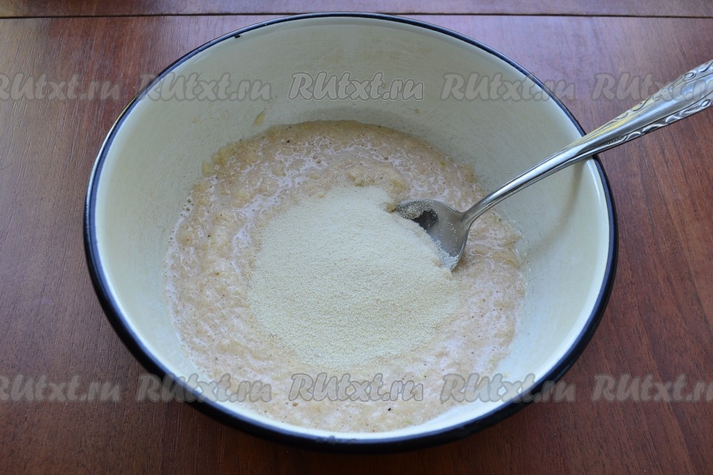 Выложить луковое пюре в миску, всыпать манную крупу, перемешать и оставить на 30 минут для набухания манки.