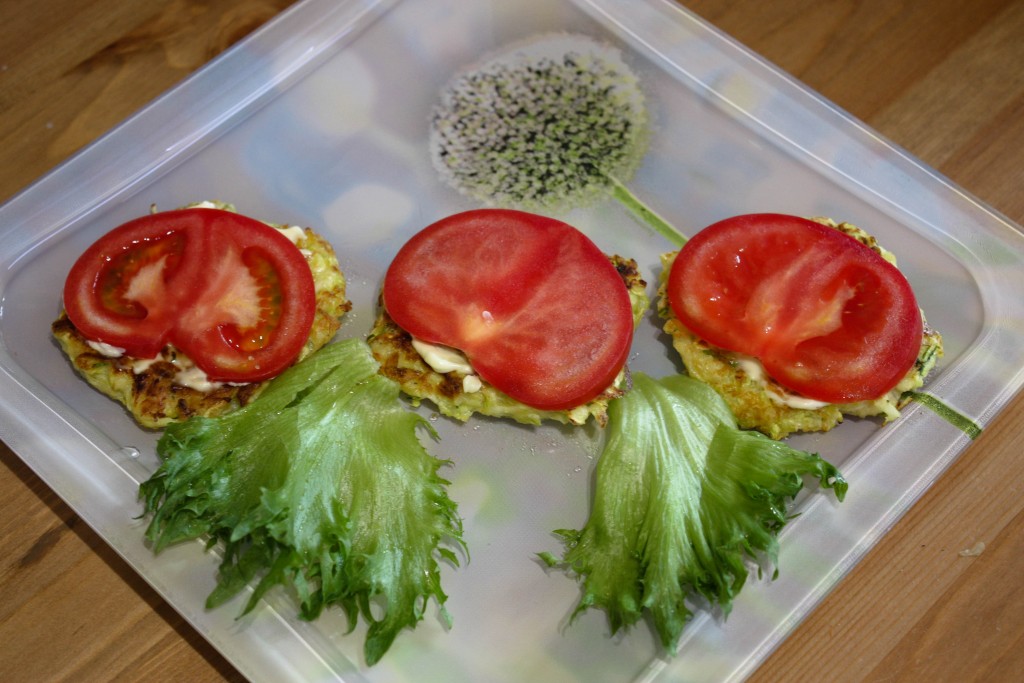 Сверху положить помидоры, нарезанные кружочками. Украсить зеленью. Оладьи из кабачков - великолепная закуска, попробуйте!