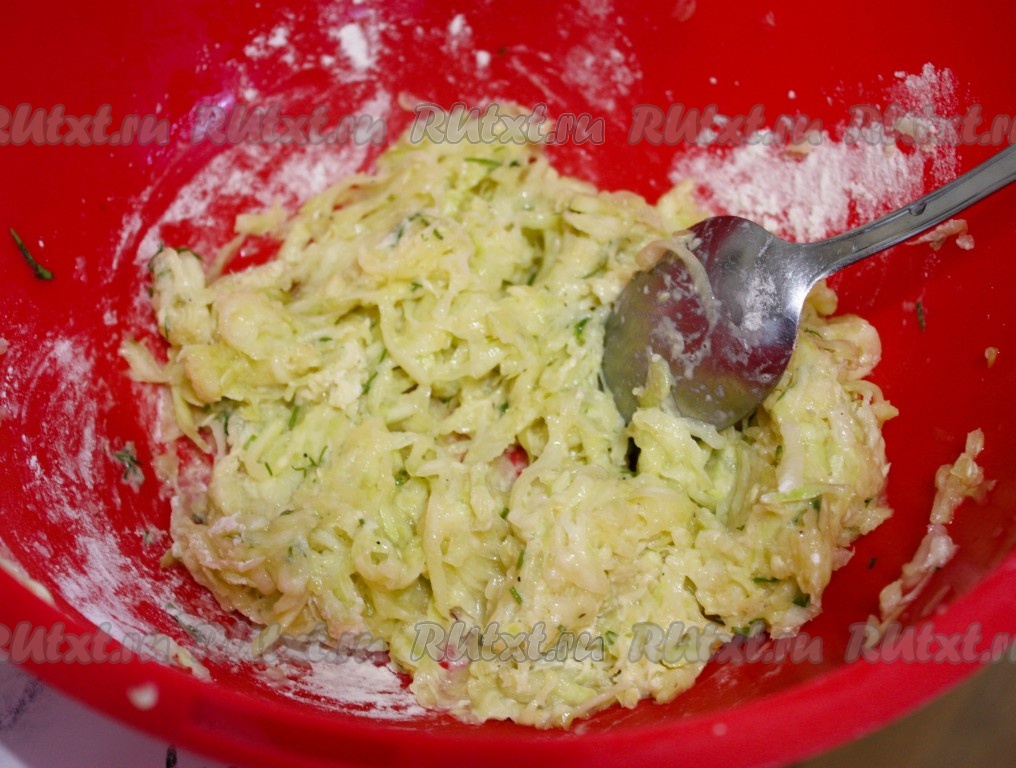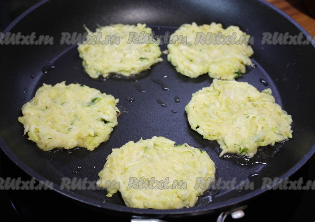 На разогретую с растительным маслом сковороду выкладывать кабачковую массу, придавая форму лепешки толщиной не более 1 см.
