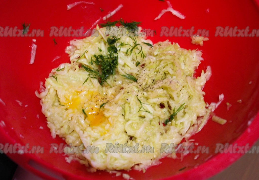 Образовавшуюся жидкость слить, кабачок отжать, добавить черный молотый перец, яйцо, мелко нарезанную зелень, перемешать.