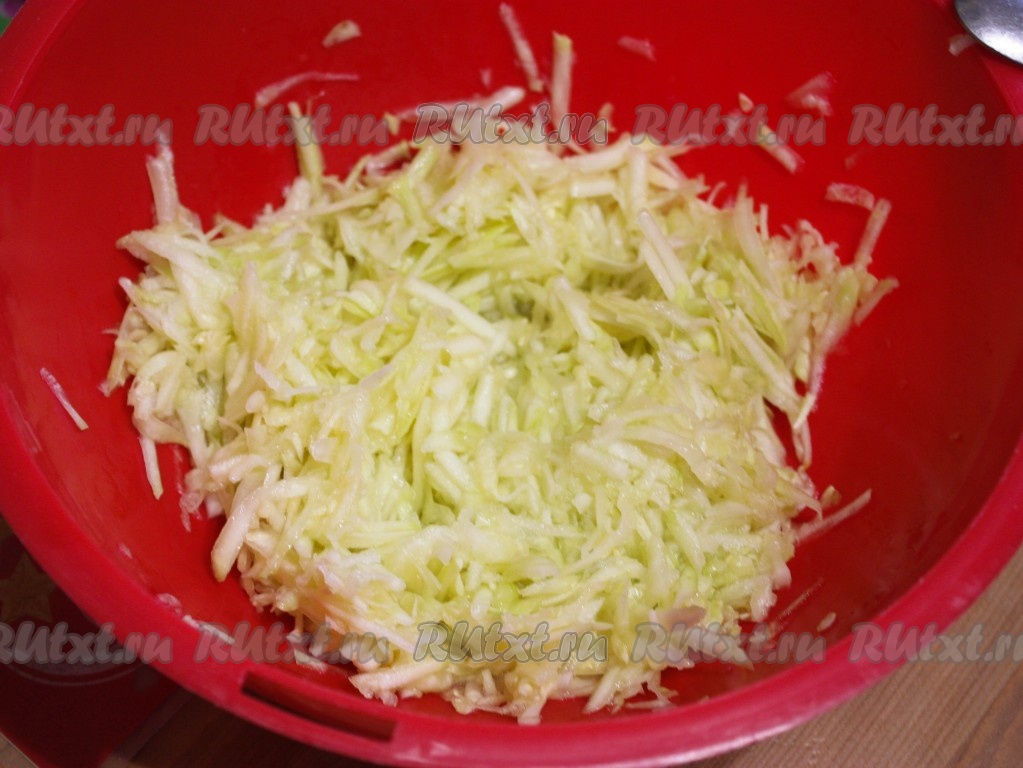 Кабачок вымыть (если кабачок молодой, то кожуру можно не очищать), натереть на терке, посолить, перемешать и дать постоять минут 10-15, чтобы вышла лишняя жидкость.