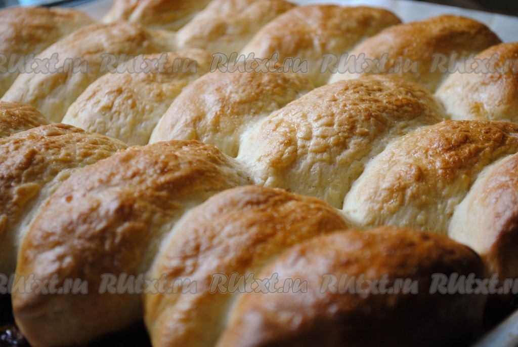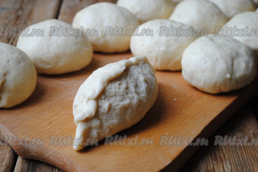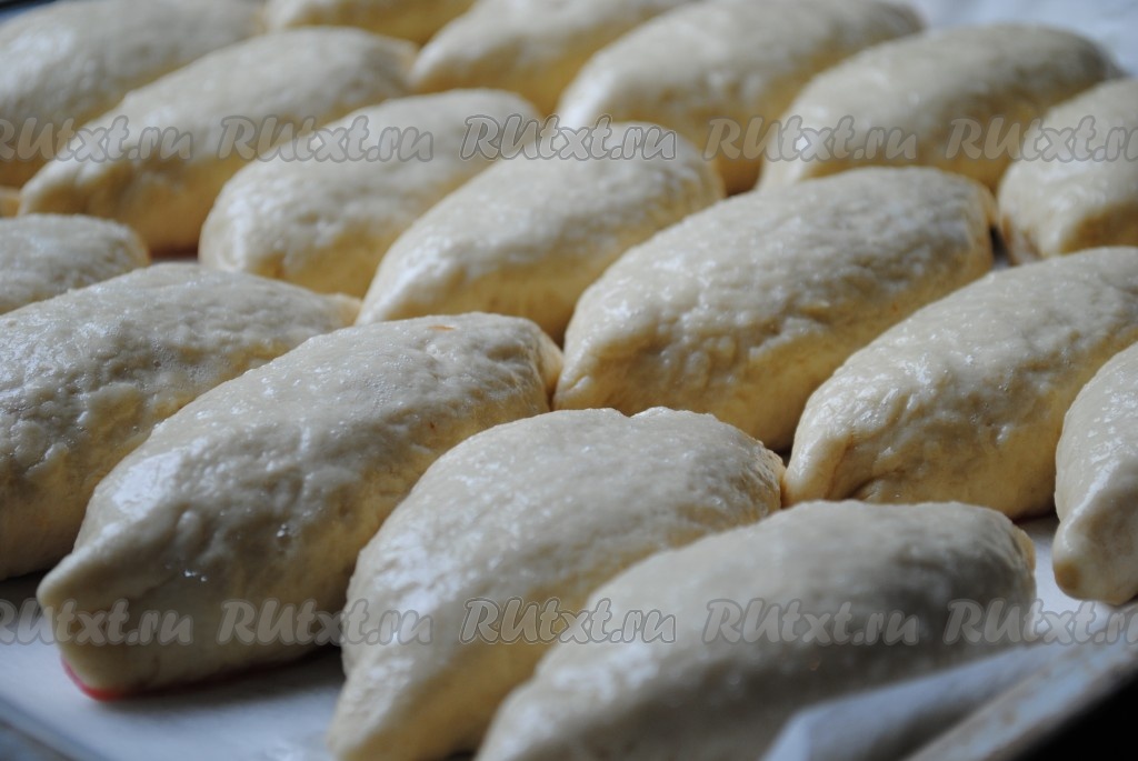 Противень застелить пергаментом и выложить пирожки швом вниз. Накрыть их полотенцем и дать постоять 10 минут. Затем смазать их взбитым белком.
