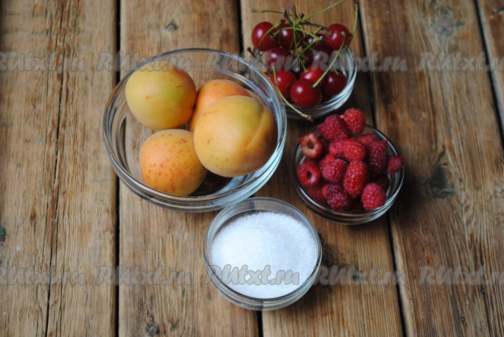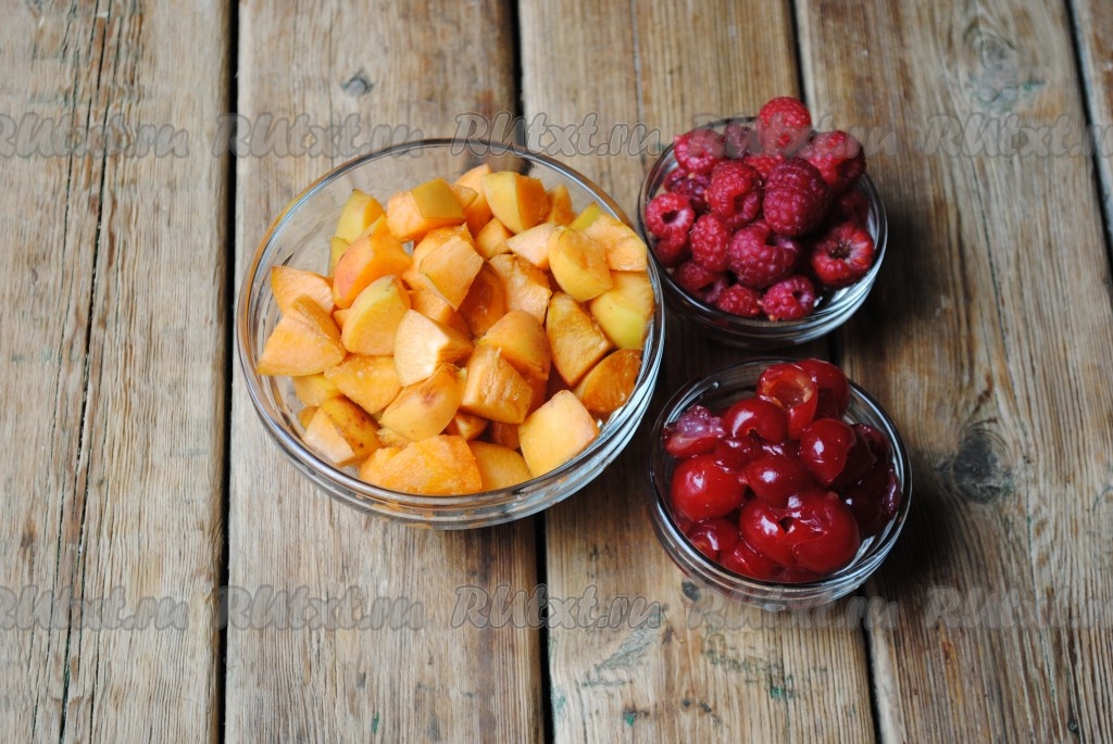 Ягоды вымыть. Из абрикосов и вишни удалить косточки. Абрикосы нарезать на небольшие кусочки.
