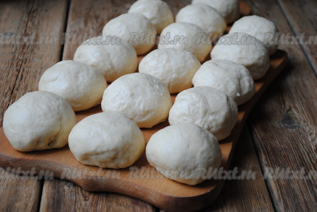 Готовое дрожжевое тесто разделить на 20 равных частей. Из каждой части теста скатать небольшой шарик. Накрыть их полотенцем и дать отдохнуть 5 минут.