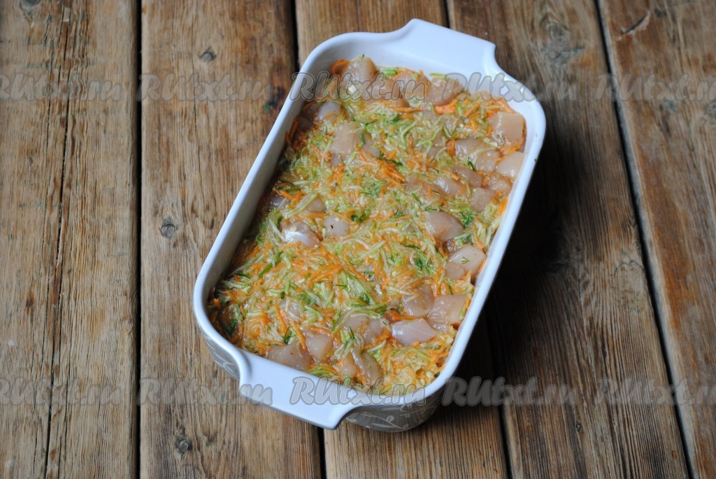 Затем соединить кабачки с замаринованным куриным филе, перемешать и выложить получившуюся смесь в жаропрочную форму (при желании, форму можно смазать маслом), разровнять будущую запеканку.