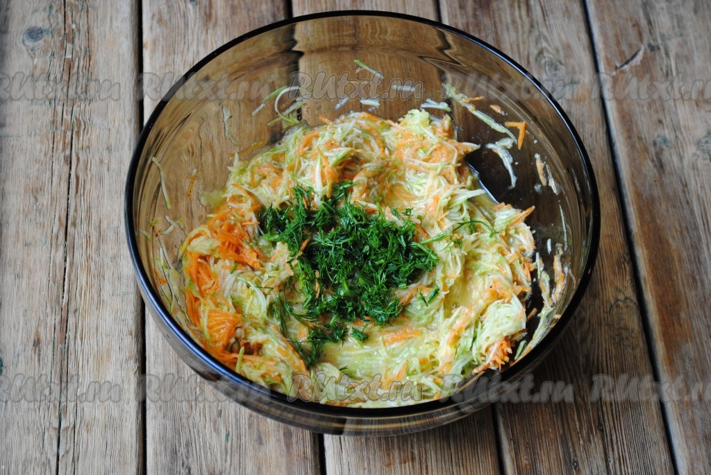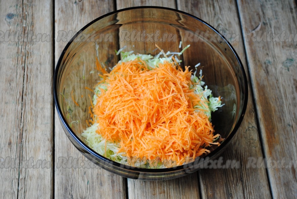 Морковь натереть на тёрке и добавить к кабачкам.