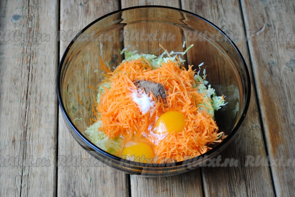 Вбить к морковке и кабачкам яйца, посолить и поперчить по вкусу, хорошо перемешать.