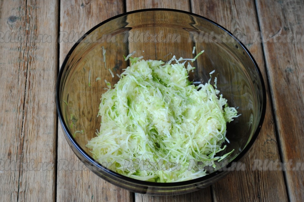 Кабачки вымыть и обсушить. Если кабачки молоденькие и шкурка у них тоненькая, то очищать её не надо. Кабачки натереть на средней терке, дать постоять 15 минут, затем их отжать. Лишняя жидкость в этом блюде не нужна, иначе запеканка будет слишком водянистой.