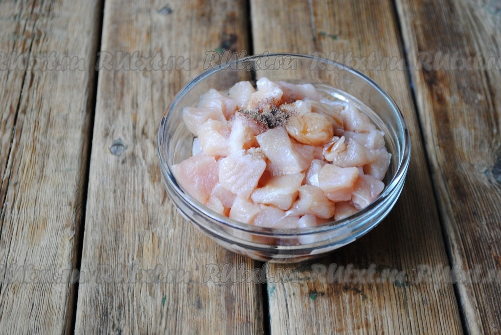 Куриное филе вымыть, обсушить, нарезать на небольшие кусочки, добавить щепотку соли и перца, влить соевый соус, перемешать и оставить на 5-10 минут, чтобы мясо замариновалось.