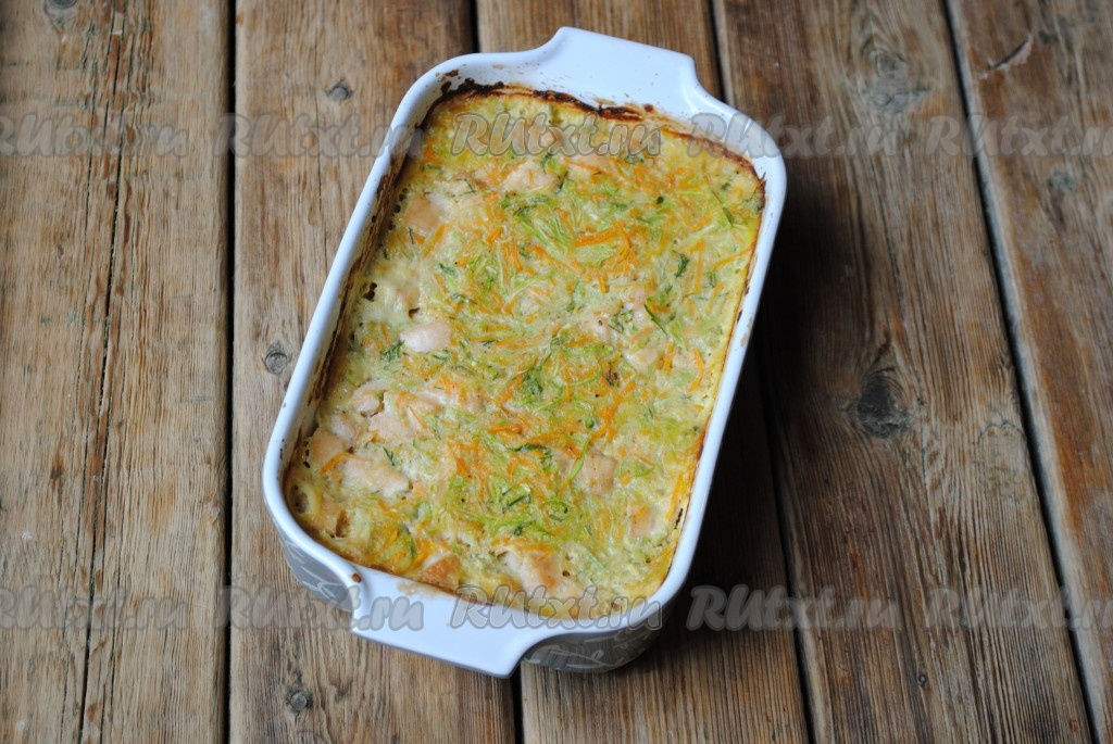 Отправить в разогретую до 180-190 градусов духовку на 40 минут. Запеканка из кабачков и куриного филе должна схватиться, стать более плотной (без мокрых очагов).