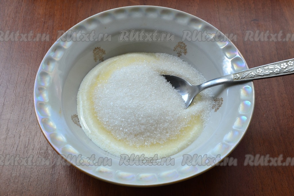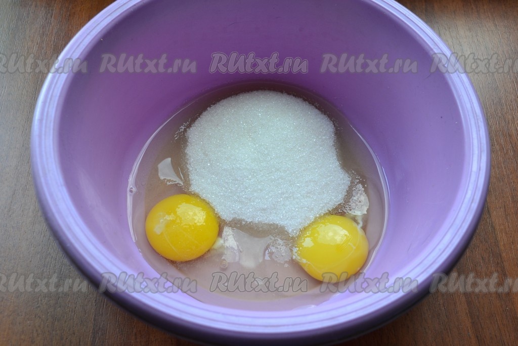 В отдельную миску всыпать сахар, вбить яйца.