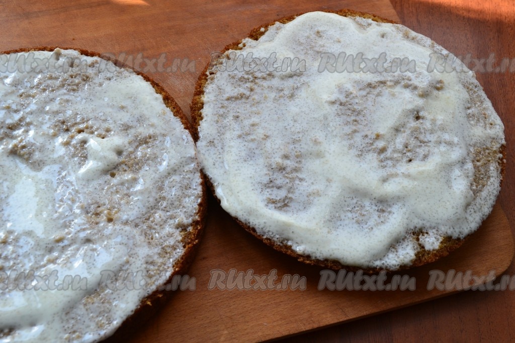 Разрезать пирог на 2 части. Каждую часть хорошенько (2 раза) промазать сметанным кремом.