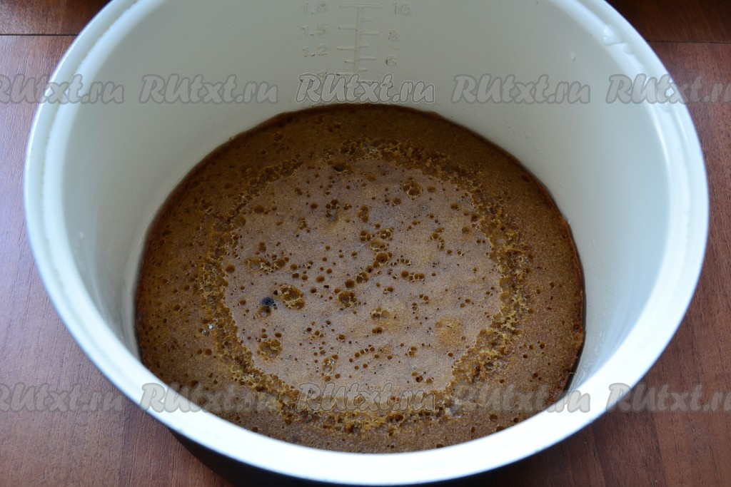 Выставить программу мультиварки "Выпечка" на 60 минут. Крышку мультиварки закрыть. После окончания программы "Выпечка" проверить готовность, проколов кофейный пирог сверху сухой деревянной палочкой, если после прокола на палочке не будет следов теста, значит выпечка готова.