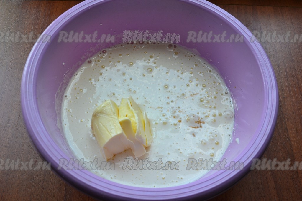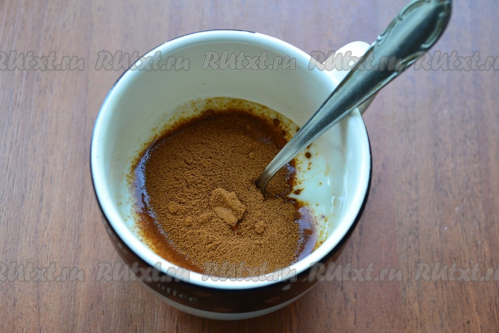 Кефир можно использовать любой жирности. Кефир для замешивания теста нужно будет либо достать заранее, чтобы он успел согреться до комнатной температуры, либо подогреть в течение 15-20 секунд в микроволновке. Сливочное масло должно тоже быть комнатной температуры, его нужно либо заранее достать из холодильника, либо поместить в микроволновку и прогреть в течение 20-30 секунд, масло должно согреться и немного размягчиться, но растопиться до жидкого состояния оно не должно. Кефир комнатной температуры влить в чашку, всыпать кофе, перемешать и оставить на 10 минут. Кофе должно полностью раствориться в кефире.