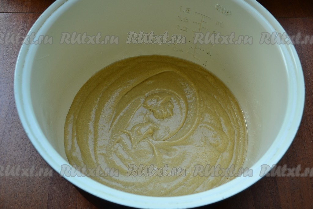 Чашу мультиварки смазать изнутри растительным маслом, выложить тесто.